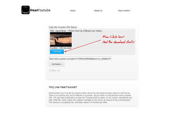HearYoutube es un servicio web que nos permite conseguir las pistas de audio de los videos de YouTube de manera rápida y sencilla. Solamente accediendo la URL del video el programa ya comienza a trabajar y en poco menos de un minuto ya te ofrece un link de descarga para conseguir la pista en un archivo de MP3.
