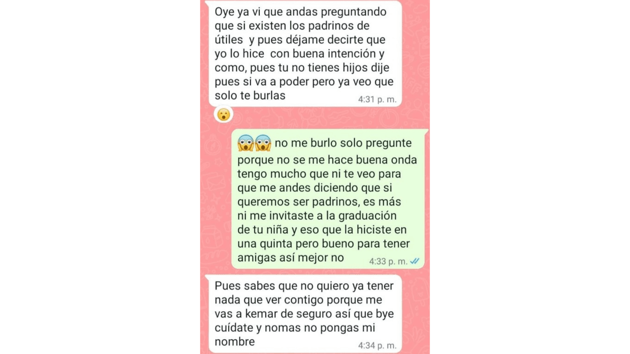 De acuerdo a la evidencia, Liliana contestó que lo pensaría. Poco después en la misma conversación su amiga comenzó a reclamarle, esto luego de percatarse de que había preguntado en redes sobre "los padrinos de útiles escolares".