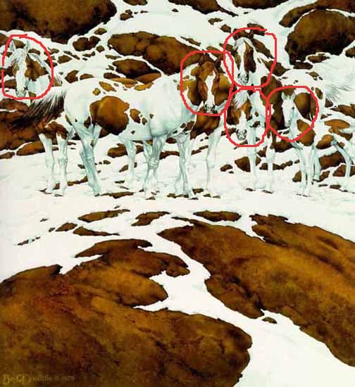«I was observing a small group of chestnut horses in a grassy meadow when I became aware that they were "observing" me. This seemed like an interesting situation for a painting. I also thought it would be fun to have the horses observing you, the viewer, before you could find the horses! So I began to think of ways to camouflage them. The chestnut horses became Pintos, and the grassy meadow turned into a backdrop of rocks and snow».