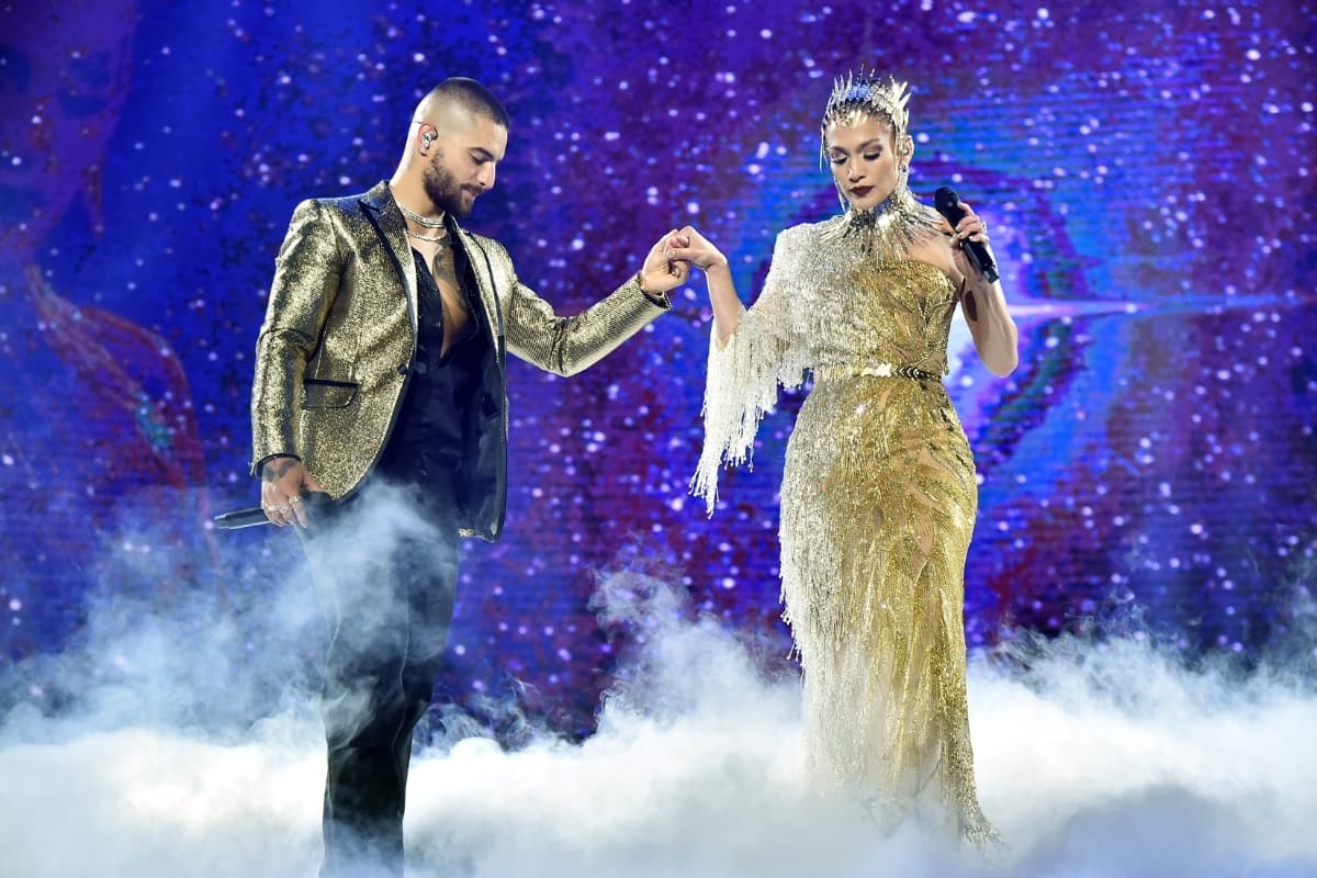 Esto lo logró con dos outfits: un glamouroso vestido para la red carpet y un leotardo para su presentación con el reggaetonero Maluma.