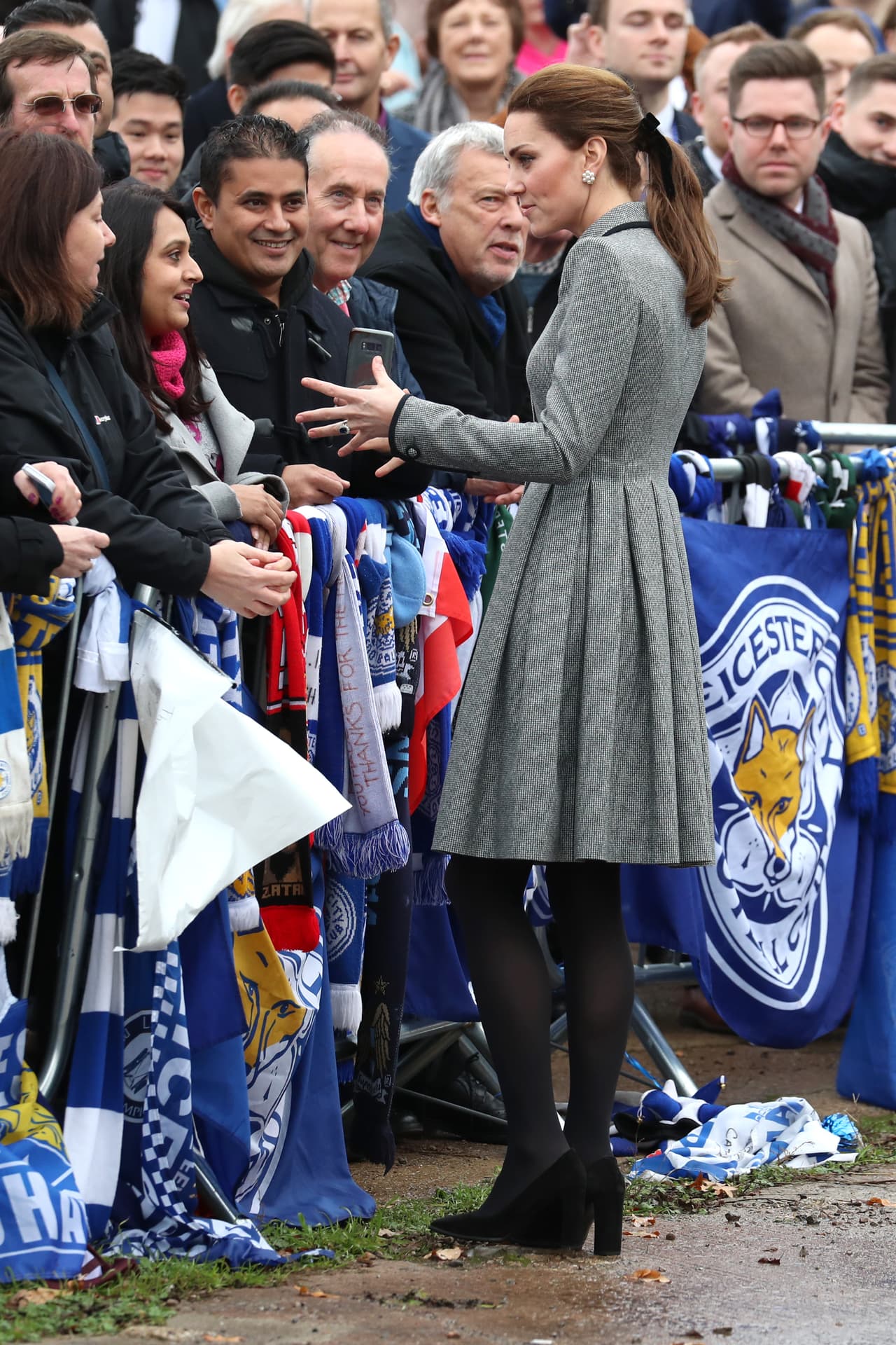 El 28 de noviembre, el Príncipe William y Kate Middleton visitaron la ciudad de Leicester. Ahí la pareja honró la memoria de las víctimas que perdieron la vida en un accidente de helicóptero el pasado 27 de octubre. Después de la ceremonia, la Duquesa de Cambridge se tomó un momento para saludar a los miembros del público.