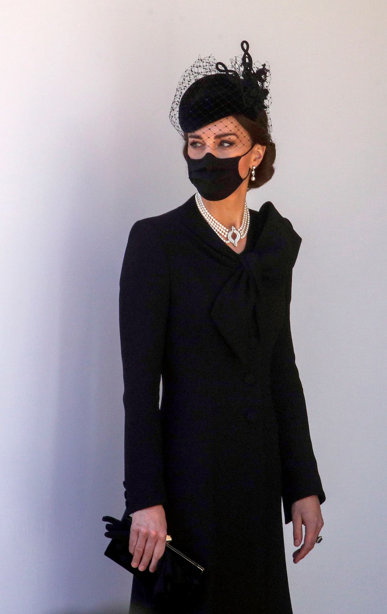 Bajo el abrigo, muy probablemente llevó un vestido o falda midi, por encima de las rodillas, que combinó con medias, stilettos, un tocado con velo, un bolso de mano y una mascarilla igualmente de color negro.