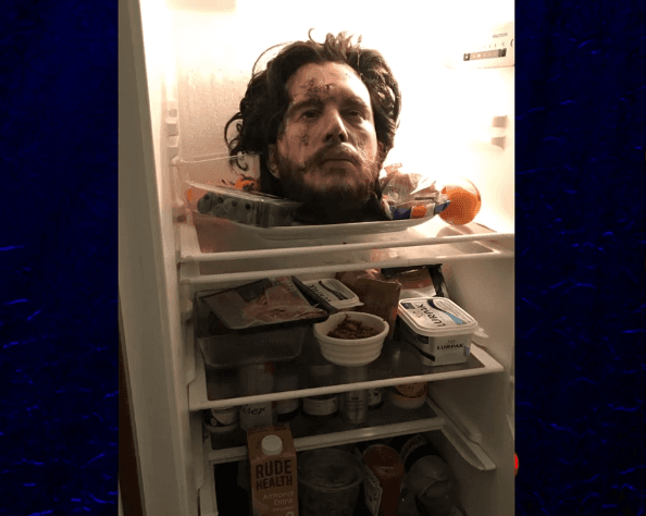 Pero, ¿qué fue lo que la hizo saltar de miedo de esa manera? Kit no tuvo mejor idea que colocar una cabeza falsa suya, ensangrentada, dentro del refrigerador. Y para alguien que no tiene en cuenta la fecha del día de las bromas pesadas, seguro debe ser muy perturbador.