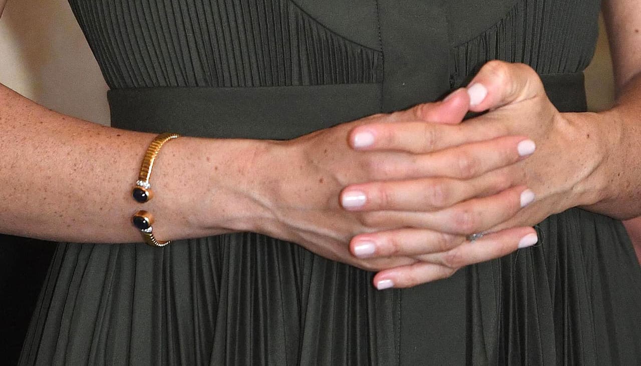 Junto con los aretes, Meghan también llevó un brazalete de oro con piedras azules que alguna vez perteneció a Diana.