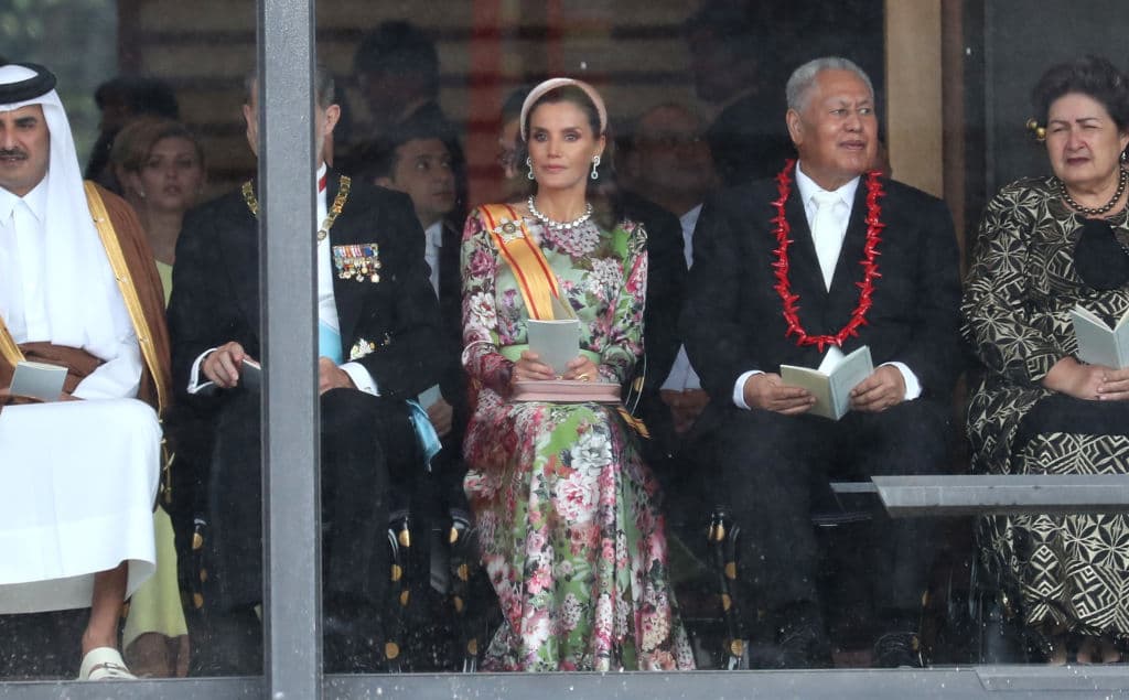 Acorde al protocolo japonés, la reina cubrió su cabeza con un tocado de tela rosa, confeccionado artesanalmente por la firma española Nana Golmar. Agregó a su outfit otros notables accesorios de renombre: bolso estilo clutch de Carolina Herrera y joyas con una gran historia familiar.