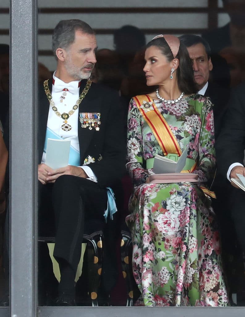 La monarca española eligió para la solemne ocasión destacar con un look enteramente floral, dejando claro que aún en el frío otoño oriental los colores de la primavera también pueden lucir magníficos.