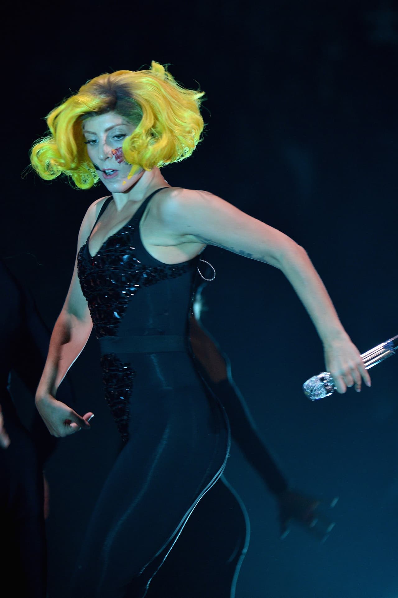 La famosa estrenó su nuevo single Applause, haciendo réplica de algunas escenas del vídeo musical. Aprovechó la oportunidad para vestirse de monja, lucir un jumpsuit negro, varias pelucas y hasta protagonizar un semi desnudo.