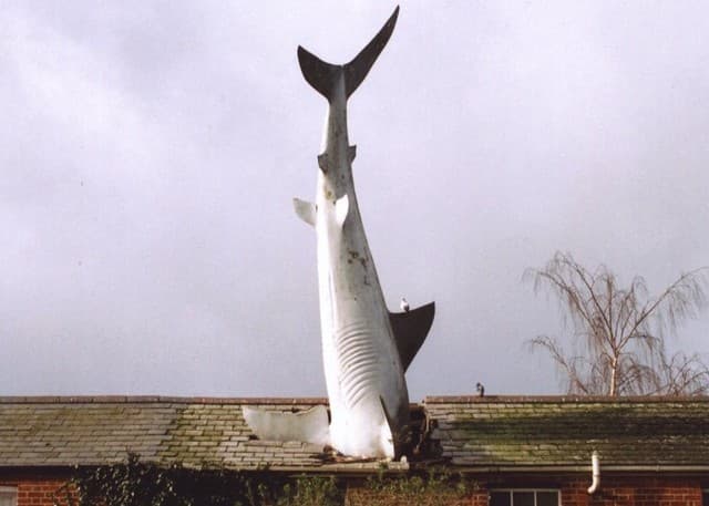 Un pacifista inglés quería protestar contra el uso de armas nucleares y en 1986, en el aniversario N° 41 del bombardeo de Nagasaki, develó un monumento de un tiburón de 8 metros estrellándose de cabeza contra el techo de su casa. El Tiburón de Headington es una atracción de ese suburbio de Oxford.