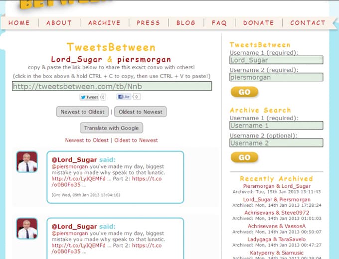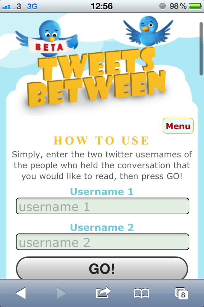 TweetsBetween es una aplicación web que te permite leer conversaciones entre usuarios de Twitter sin la necesidad de pedir ningún permiso especial. Con TweetsBetween puedes estar al tanto de las discusiones de los usuarios que más te interesan ya sean amigos, familia, famosos, instituciones u otro tipo de usuarios. Por ejemplo, puedes seguir las famosas discusiones del ámbito de la farándula que cada tanto decoran las principales tapas de revistas, o puedes utilizarlo con tus círculos cercanos para mantener un buen registro de las conversaciones. En definitiva, Tweets Between más que seguir una discusión, nos permite reestructurarla reconfigurándola en un contexto más cómodo para su lectura.
