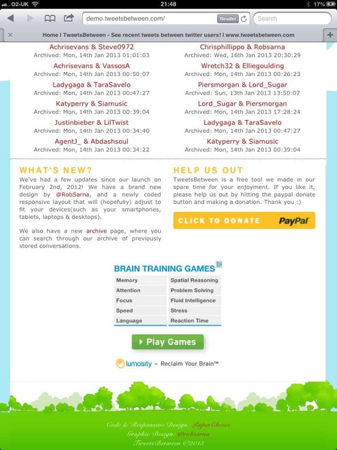 TweetsBetween es la mejor herramienta web para trabajar con Twitter debido a que nos ayuda a rastrear algunas conversaciones que pueden resultar de nuestro interés entre dos usuarios. Funciona de forma similar a otras aplicaciones como Contweet, aunque ésta última tiene menos tiempo de desarrollo y, por ende, puede resultar un poco más defectuosa.