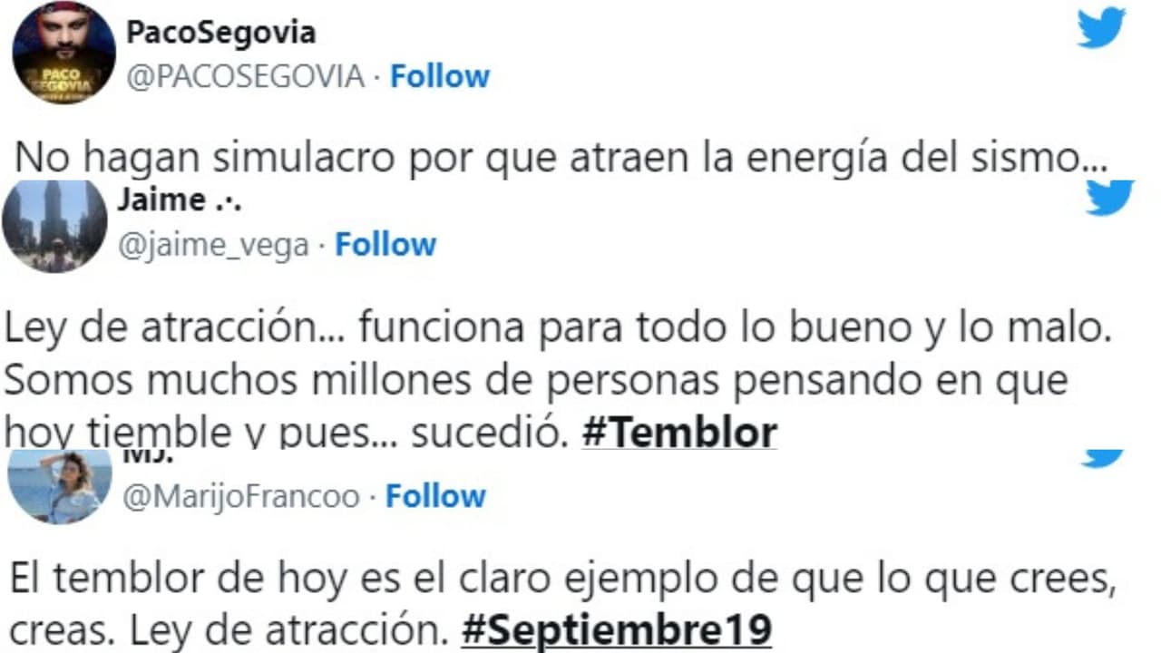 "Cambié de opinión, ya me dio miedo la 'Ley de atracción'", "Perdón por burlarme, pero ya no es gracioso que sí haya pasado el temblor", "No volveré a pensar en los temblores el 19, que tal si provocamos otro", o "El temblor de hoy nos dejó algo claro, aguas con la 'Ley de atracción'", fueron algunos puntos de vista en Twitter.