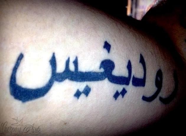 Este diseño de una frase en árabe, de acuerdo a lo que nos cuenta Iván, fue hecho para simbolizar lo agradecido que se siente por formar parte de su familia, la familia Rodriguez. A decir verdad, resulta un poco difícil pensar que en árabe pueda escribirse un apellido como el de su familia, pero si Iván le ha dado este significado, eso es lo que importa. Este diseño costó $450, equivalentes a unos USD 35, y también fue realizado en Irapuato, por el tatuador Ricardo Pacheco.