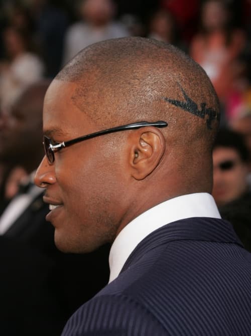 Así hemos llegado al primer lugar amigos, este lo he reservado para Jamie Foxx y su lamentable tatuaje en la cabeza. Como dejé en claro cuando hablé de los 5 tatuajes que nunca me haría o cuando hablé del arrepentimiento de los tatuajes, tatuarse la cabeza no me parece una buena idea, o mejor dicho: me parece bastante torpe.