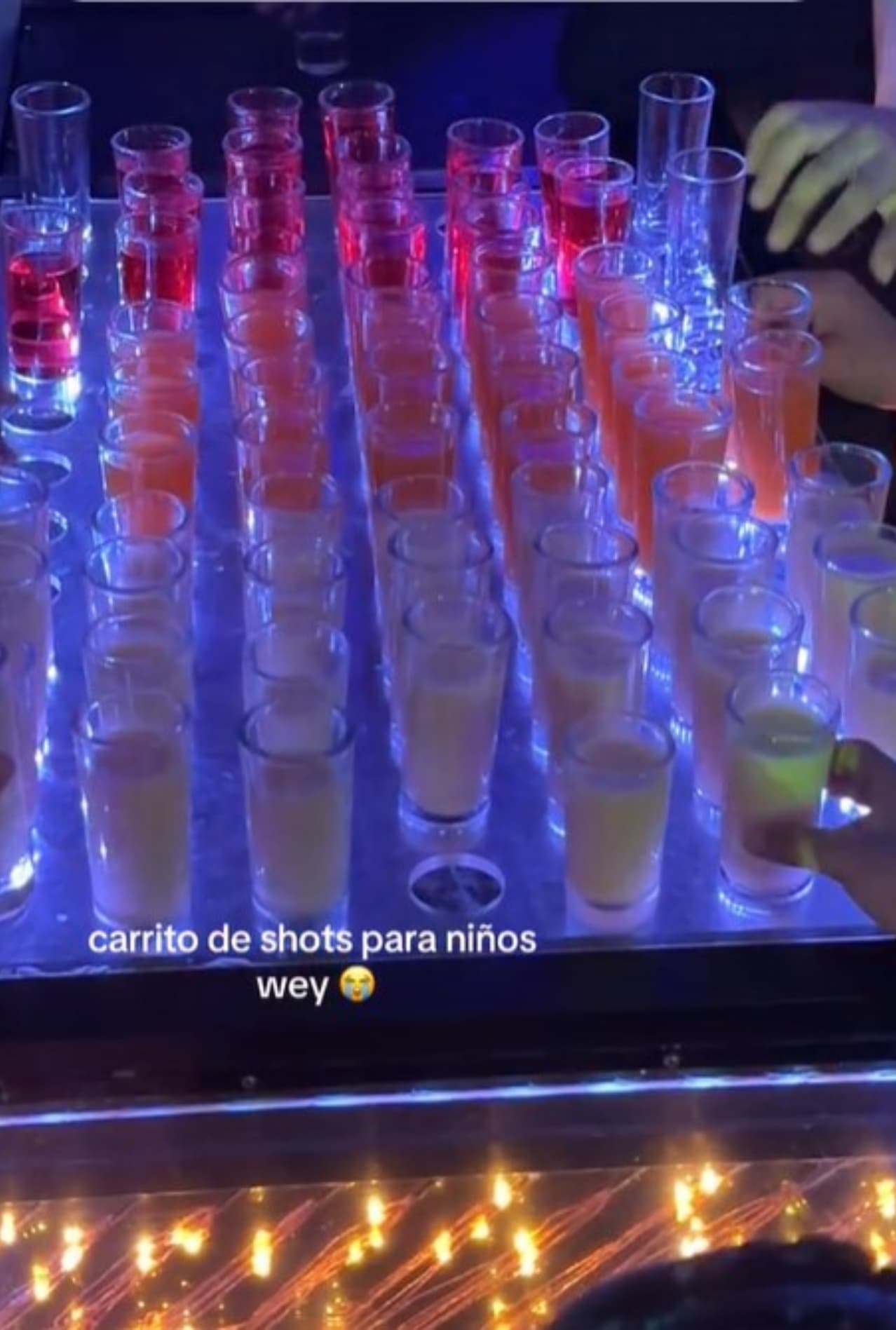 Uno de los elementos que más sorprendió a los usuarios fue la presencia de un robot con luces que animó la fiesta, así como el carrito de shots para niños, algo que muchos consideraron inusual para una fiesta infantil.