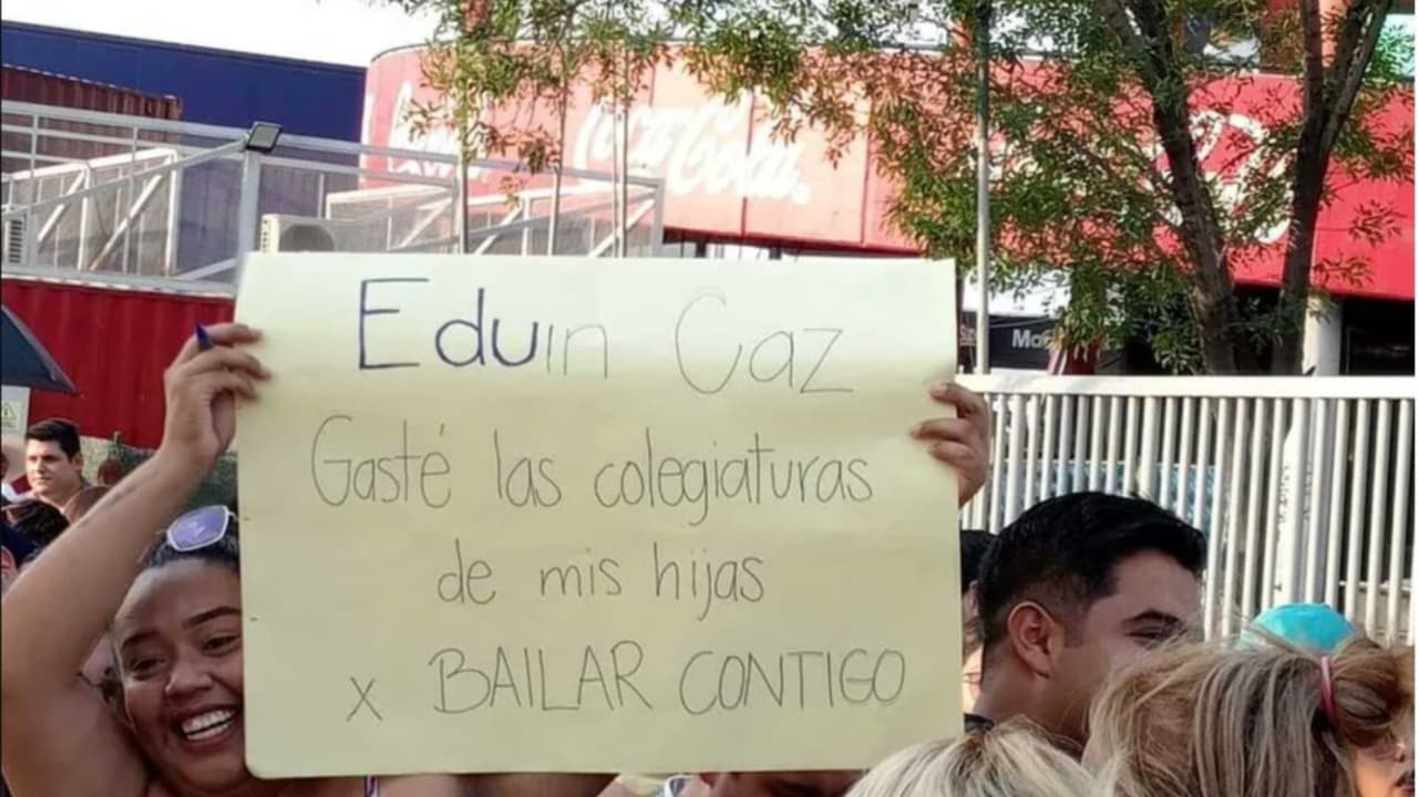 La mujer fue captada por las cámaras de una televisora local afuera del recinto con un mensaje que decía: "Eduin Caz, gasté la colegiatura de mis hijas x bailar contigo"; por lo que fue entrevistada por dicha televisora, a la que narró su pequeña historia.