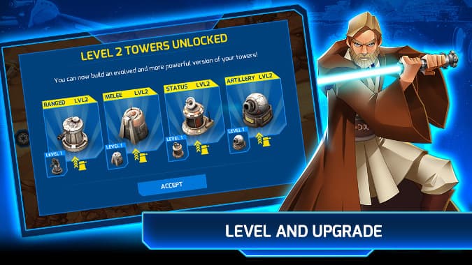 Uno de los puntos interesantes es que puedes elegir un bando, ya sea del lado luminoso o del lado oscuro. Ambos tienen sus tipos de unidades, torres y enemigos, así como un amplio catálogo de héroes que podrás utilizar en batalla como Darth Maul, Han Solo o Ezra Bridger de la reciente serie Star Wars Rebels. Cada uno de los héroes cuenta con una habilidad especial que podrá usar en distintas ocasiones según se llene la barra. Además, mientras más avances en el juego podrás disponer de hasta 4 héroes por batalla. A su vez serás capaz de mejorar de nivel tanto tus torres como a tus héroes y también equiparles reliquias que mejorarán su eficiencia.
