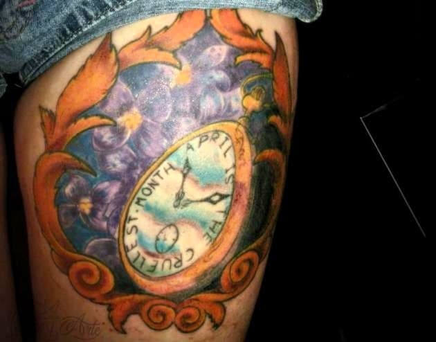 “El diseño lo realicé en lápiz y papel como boceto y lo terminamos de armar con el tatuador. Significa mi amor por la literatura, por la poesía, además de encerrar un poco el recuerdo de mi amor de la adolescencia. El reloj está inspirado en la edición peruana de un libro llamado No me esperen en abril, cuyo primer epígrafe es justamente la frase (...) Las lilas representan el segundo verso del poema, que se refiere a las lilas que nacen en el mes de abril. Me pareció que en un camafeo quedaría bien encuadrado todo.”