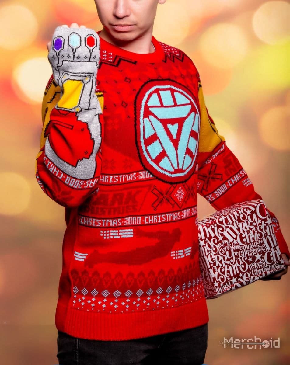 La tecnología estará de tu lado con el fantástico suéter de Iron Man, que no sólo tiene el corazón del famoso superhéroe, también cuenta con el guantelete Stark con gemas incluídas.