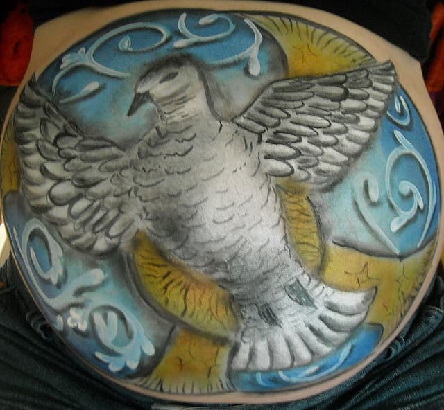 Aquí nos encontramos con mamás que decidieron pintar su pancita con el motivo del Arca de Noe, con el árbol de la vida, con la figura de un pequeño bebé, en la posición en la que debería estar en el interior de la pancita. También está el ejemplo del tigre o del puzzle. ¿Razones?
