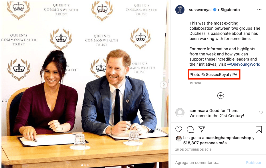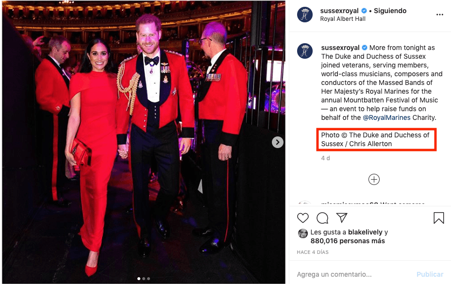 Una de las primeras pruebas de esto es el cambio en el copyright de sus fotografías oficiales, en su cuenta de Instagram. Anteriormente, al final de sus publicaciones se leía «Photo © SussexRoyal».