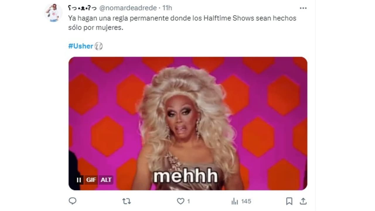 "Usher no fue malo. Es de los pocos hombres que han sabido cómo hacer un show No te gustó porque solo conoces 2 canciones- Entre los hombres ha sido de los mejores, pero si lo comparan con alguna diva del pop ahí la discrepancia", "Usher dejó todo en el escenario, cantó en vivo, bailó perfecto. Que no les guste su música o él, ya es otra cosa. Además, todas (o casi todas) las canciones que cantó fueron hits cañones en su momento" y "Que no sepan las canciones de Usher y no tengan idea quienes eran los invitados , no lo hace un mal show", resultaron ser otras opiniones.