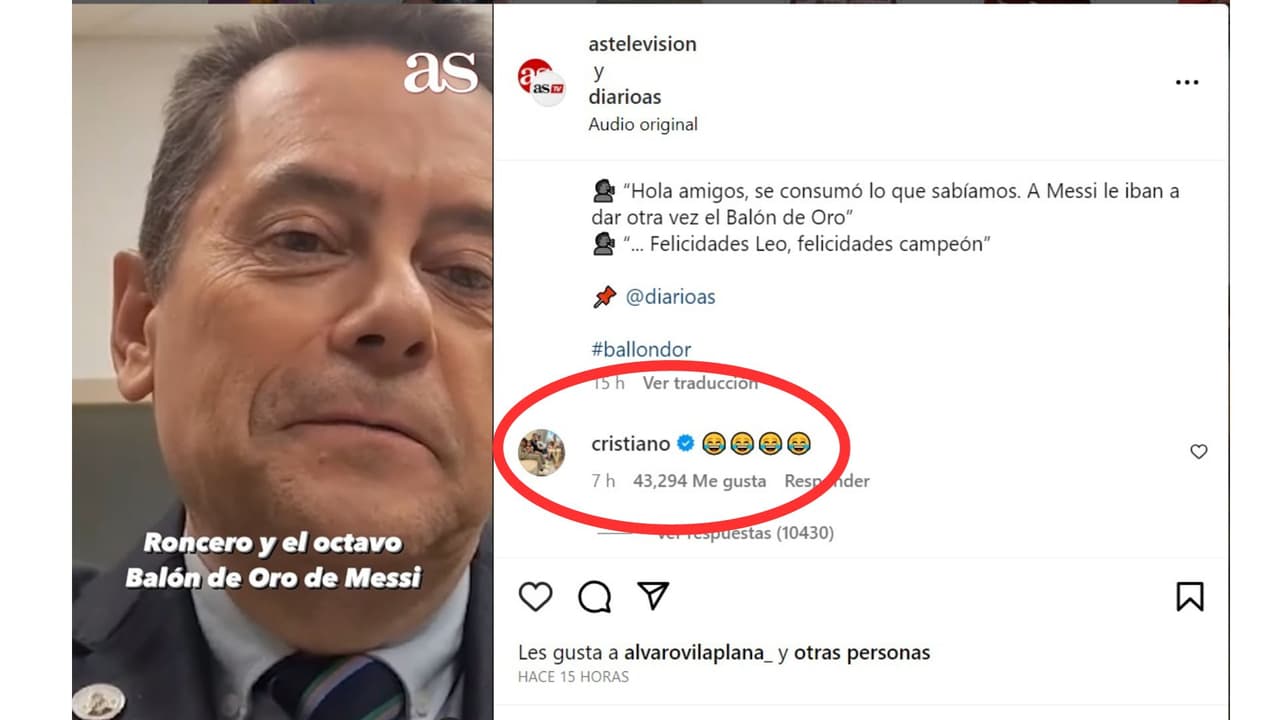 Este post se volvió viral después de que el mismísimo Cristiano Ronaldo lo comentara con emojis de risa, dando a entender que está de acuerdo con Roncero en cuanto la decisión de darle el Balón de Oro a Messi.