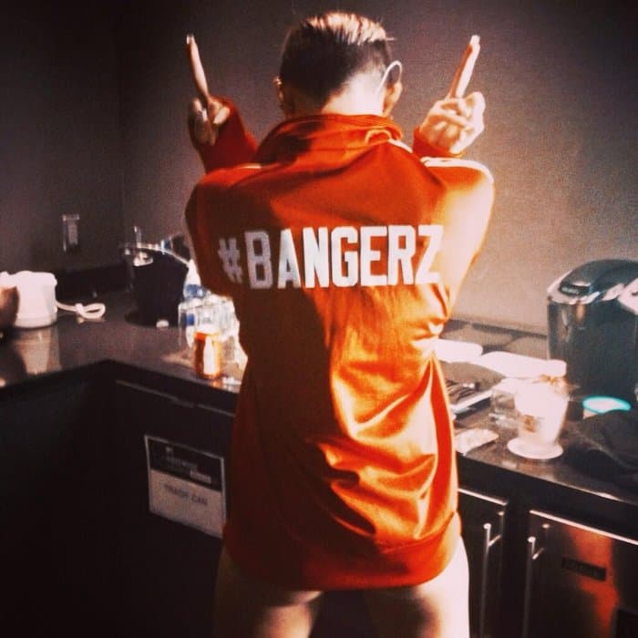 Recientemente ha subido unas cuantas fotos a su cuenta de Twitter. En una de ellas puede verse su trasero a pesar de tener una camiseta larga, en otra se destacan sus curvas y en otra puede verse a Cyrus riendo eufóricamente.