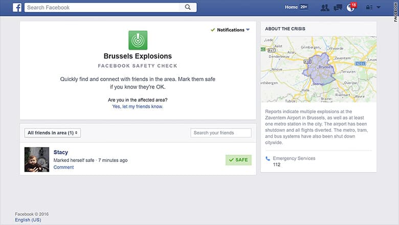 La red social Facebook ha activado la comprobación de estado de seguridad para Bruselas. A través de esta opción, las personas que se encuentran cerca de la zona del atentado tienen la posibilidad de compartir que se encuentran bien para que sus contactos lo sepan. Muchos usuarios de Facebook han pedido la activación de esta función para conocer el estado de sus familiares y amigos, ya que los problemas de comunicación de telefonía se han agravado por el sobrecargo en el servidor.