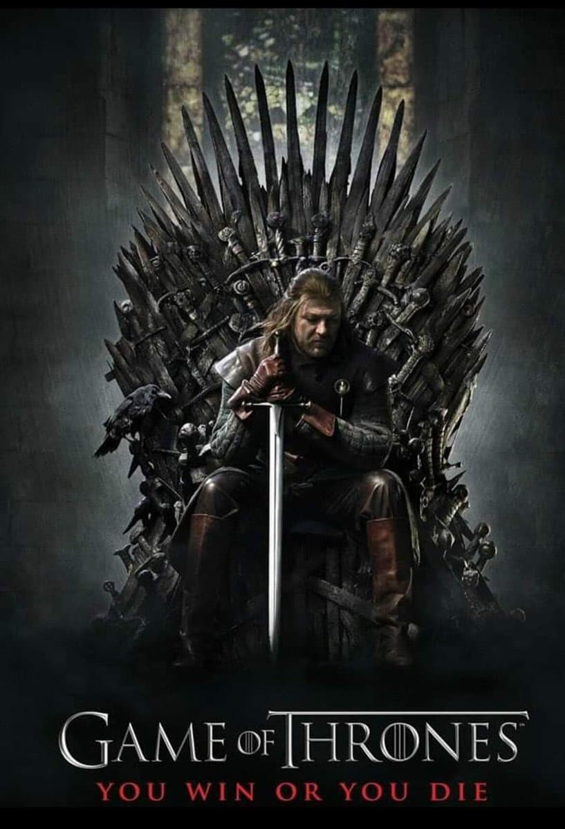 La imagen muestra a Eddard "Ned" Stark sentado en el Trono de Hierro junto a un cuervo. Algunos asiduos a la serie aseguran que no es un ave cualquiera, sino que se trata del Cuervo de los Tres Ojos, es decir, de Bran Stark.