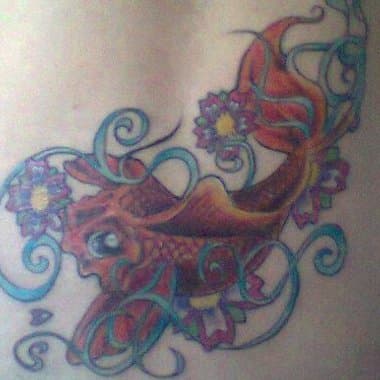 Sin duda se trata de un tatuaje sumamente atractivo a nivel visual. El koi se funde con los arabescos y con pequeñas flores que lo rodean y se convierte en un tattoo compuesto cuyo diseño salta a la vista y resulta muy bonito.