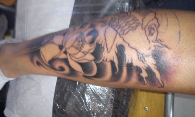 Jaime nos cuenta que para él este pez koi tiene una importancia muy grande. Le gusta tanto a nivel visual como conceptual y por ello se siente muy orgulloso de llevarlo en la piel. El koi puede nadar contra la corriente y saltar cascadas, siendo recompensado al final del viaje con una conversión en dragón. Este es el mito que nos relata Jaime y que hacen que quiera y se sienta tan feliz con su tatuaje. Dice que en este momento de su vida, a sus 20 años, se siente atravesando un momento similar al que narra el mito y por ello para él es “el diseño perfecto”.