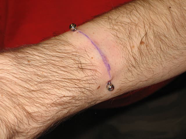 La verdad es que descubrir esta forma de hacerme un piercing me dió muchas ideas. Se las conoce como " Surface Piercings", y la verdad es que causan una interesante impresión. A simple vista parece que estos piercings estuvieran "atornillados" a la parte del cuerpo en que se encuentran. Esto genera un efecto formidable que llama la atención de cualquiera.