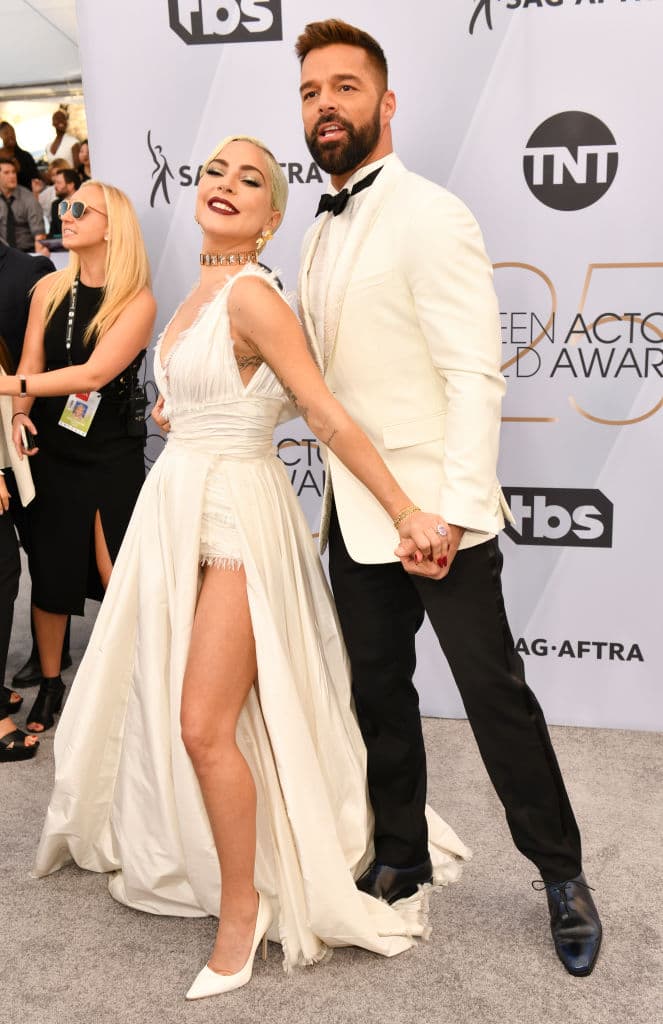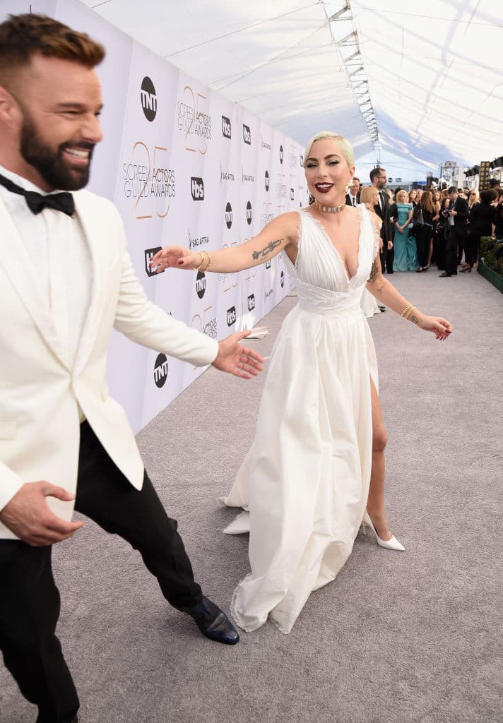 Dos potencias del mundo de la música se saludan. Lady Gaga y Ricky Martin posan en la red carpet...¡Espera! Si estos no son los Grammys... ¡son los Screen Actors Guild Awards! ¿Qué hacen los músicos en la ceremonia que premian a los mejores actores de la industria?