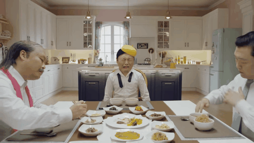 Psy niño nos asusta un poco. Psy viejo nos da un poco de asco. Y después está Psy normal que por supuesto usa traje y lentes oscuros y "aletea". Tres generaciones de PAPIS irresistibles conviviendo.
