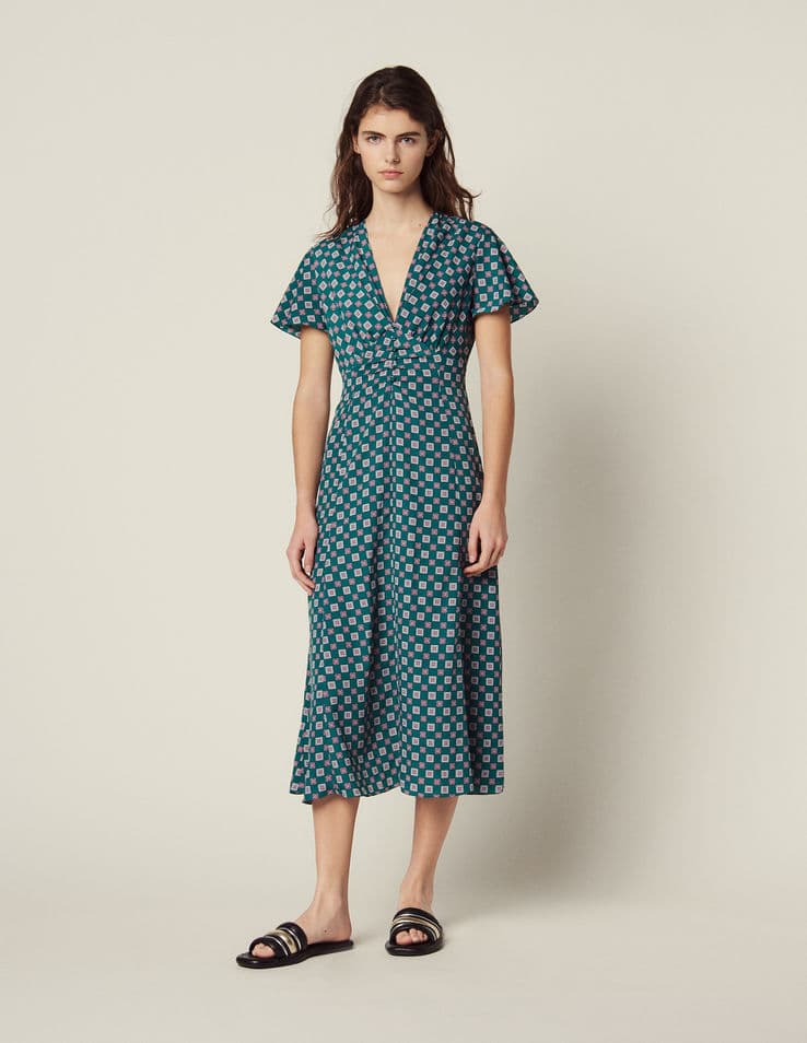 Inspirado en los años 40s, con una falda que llega a las pantorrillas, un escote en V y una cintura definida con pliegues y botones, este vestido es creación de la firma Sandro y tiene un costo de 222 euros (4765.97 pesos o 250 dólares).