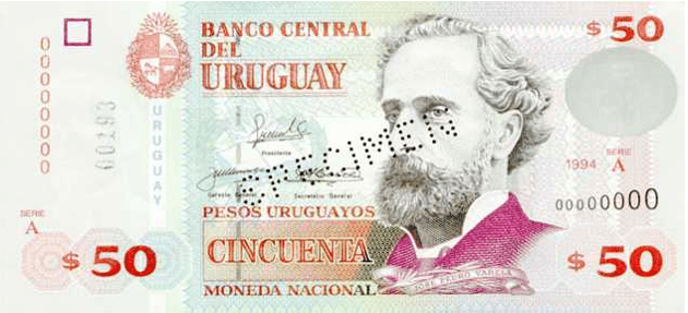 El billete de 50 pesos uruguayos es predominantemente rojo y muestra la imagen de José Pedro Varela, impulsor intelectual y político de la reforma educativa de 1877, conocida como reforma vareliana, que estableció que la educación pública debía ser laica, gratuita y obligatoria. Varela murió a los 34 años de edad a causa de una terrible enfermedad.