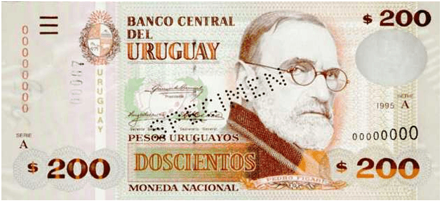 Seguimos con el billete de 200, que es de color naranja y muestra la imagen de Pedro Figari, otro de los máximos exponentes artísticos de la cultura uruguaya. Figari fue un prestigioso pintor que se destacó por sus obras sobre la cultura afrodescendiente en Uruguay. La edición más actual del billete de 200 está en circulación desde el 23 de octubre de 1995.