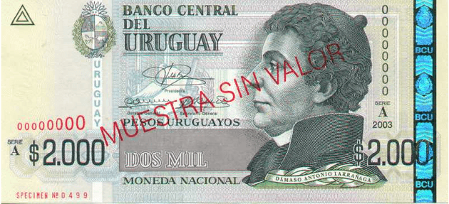 Por último llegamos al billete de 2000, que se emitió por primera vez en el año 2003 y es predominantemente gris. Muestra la imagen de perfil de Dámaso Antonio Larrañaga, quien fue un religioso, político, naturalista y botánico uruguayo que tuvo un rol fundamental en los primeros años luego de la Independencia de Uruguay.