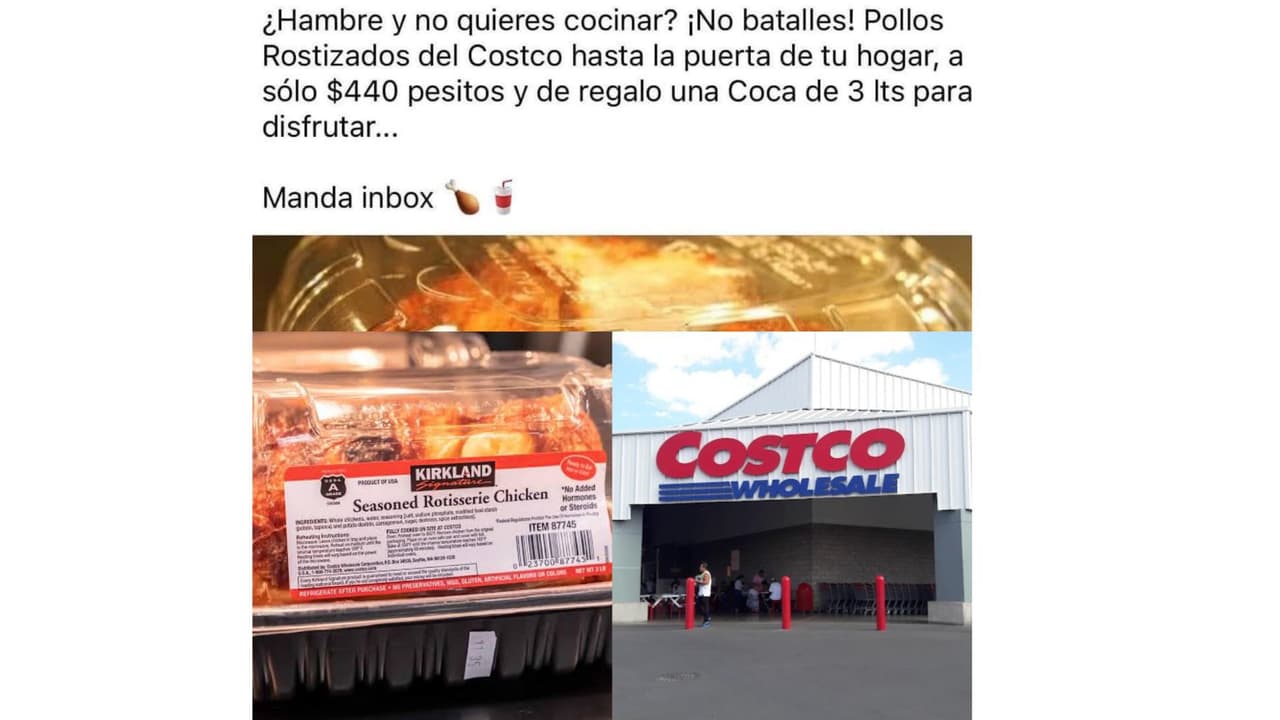 "¿Hambre y no quieres cocinar? ¡No batalles! Pollos rostizados de Costco hasta la puerta de tu hogar, a solo $440 pesitos y de regalo una Coca-Cola de 3 litros para disfrutar, manda inbox", fue el anunció.
