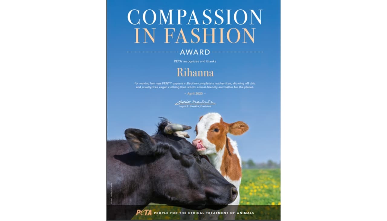 «Ella prueba que la #ModaVegana te puede hacer brillar como un diamante. PETA galardona a Rihanna con el premio Compasión en la Moda, por su asombrosa colección FENTY libre de cuero».
