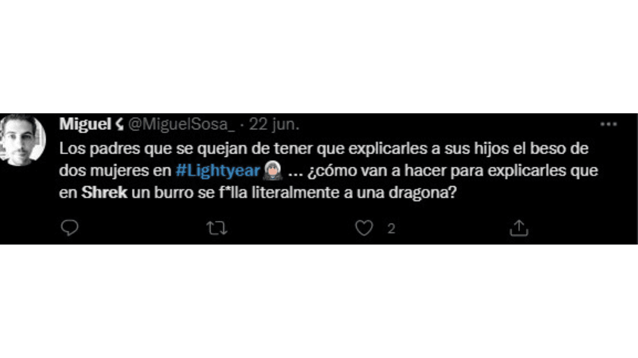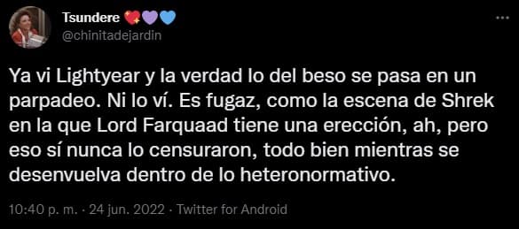 "'Shrek' tiene mil cosas más "turbias" ya dejen en paz a 'Lightyear'", "Los que se quejan de 'Lightyear' se nota que no le pusieron atención a 'Shrek'", "No pasó nada con 'Shrek' cuando se estrenó y mostraron a la hermanastra más fea, pero un beso entre dos mujeres hizo que 'Lightyear' fuera cancelada, que tontería", son algunas posturas de Twitter