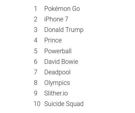 Al igual que en la mayoría de los países del mundo, lo más buscado en Google por los mexicanos fue " Pokémon GO", y la personalidad no fue nada más que Donald Trump.