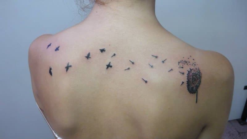 Tatuaje de aves y diente de león desintegrándose