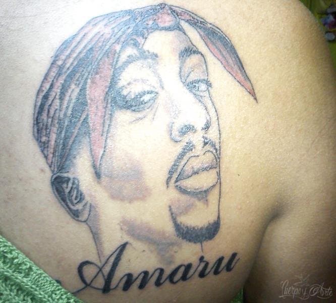 El tatuaje que pocos días atrás nos hizo llegar nuestra amiga Rosyta con tanto cariño, bien puede formar parte de nuestra sección de tatuajes de famosos, puesto que se trata de un retrato de nada más ni nada menos que el gran Tupac, el más célebre rapero que ha existido.