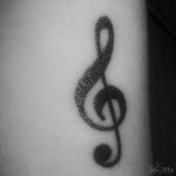 Bueno, el tatuaje de nuestra amiga uruguaya consta de dos pequeñas claves musicales, una clave de sol, en el antebrazo y casi en la muñeca derecha, y otro de una clave de fa sobre la izquierda, una concordancia muy lógica e interesante.