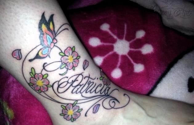 Como vemos, este tatuaje consta del nombre Patricia, esta ubicado en el pie de Carmen y esta hecho en letra cursiva. También tiene algunas flores de colores y una mariposa, que le dan un toque muy delicado y femenino. Carmen nos contó que este diseño fue realizado en honor a su hija y fue hecho en Tattoo Visión, teniendo un costo de €190, unos USD 245.