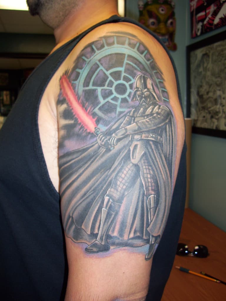 Finalmente, otro estilo muy frecuente con este personaje como motivo principal es el de los tatuajes old school, con colores opacos, rosas y la inscripción “ Dad” o “ Father”. También podemos ver algunos en el estilo de los tatuajes del día de los muertos, relacionados a la cultura mexicana, como calaveras de azúcar con la forma de Darth Vader.
