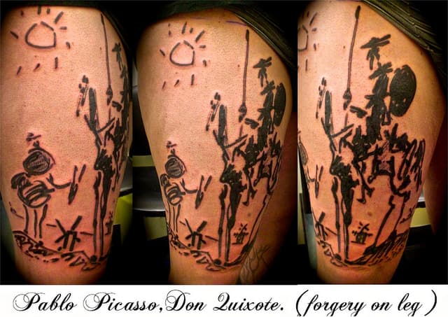 Existen varios tipos de tatuajes del Quijote de la Mancha pero seguramente el más tatuado ha de ser la ilustración de Pablo Picasso, un simple dibujo que narra perfectamente la simpleza pero a la vez complejidad de esta historia.