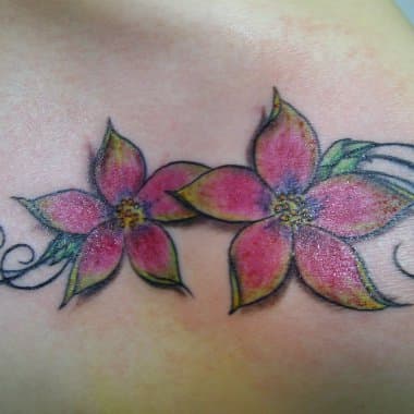 El tatuaje que Belinda nos ha mandado a través de nuestro correo de envíos cuadra dentro de este concepto respecto a los tatuajes de flores y nos muestra una creación muy femenina y delicada. Se trata de un par de flores fucsiasy amarillas ubicadas en su hombro y acompañadas de unos sencillo arabescos que componen en conjunto un tatuaje muy armonioso y estético.