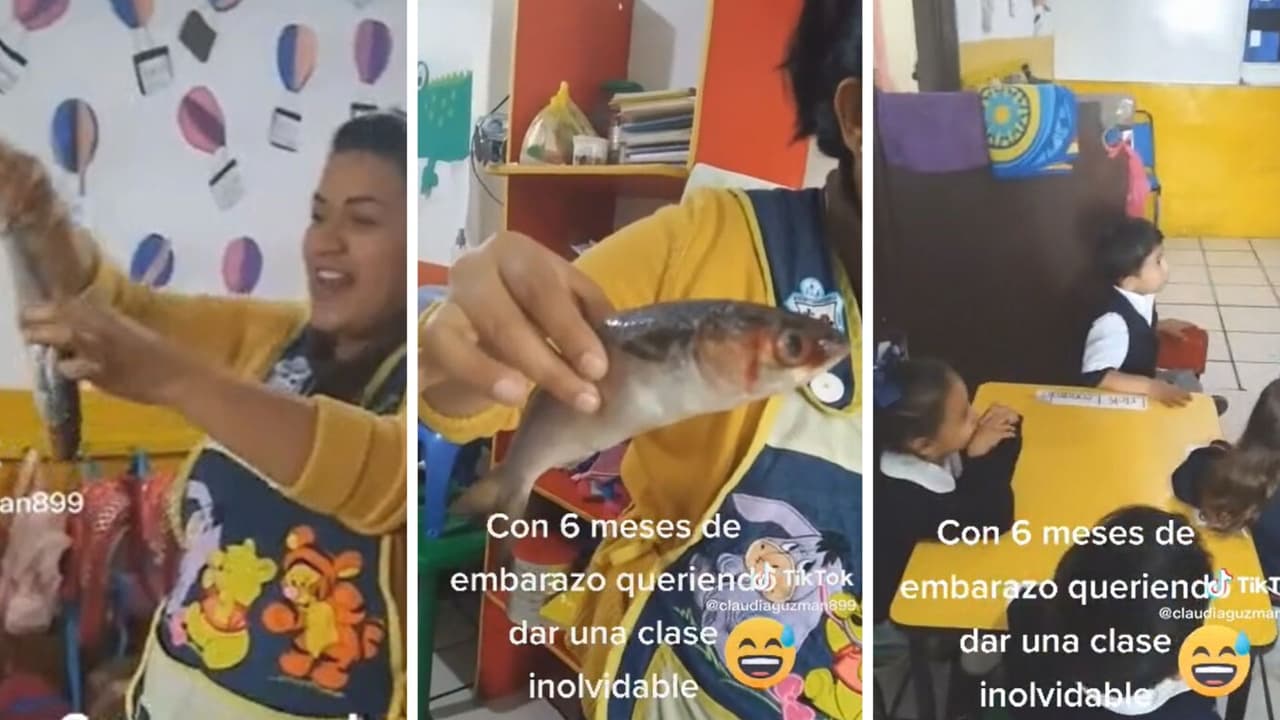 Maestra embarazada quiso dar clase con un pescado real y salió mal: video divirtió a Internet